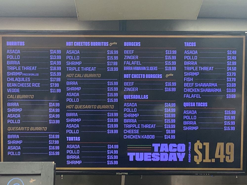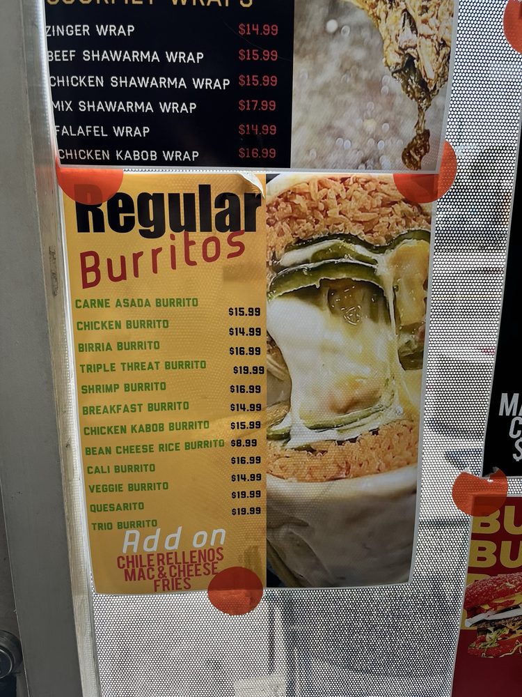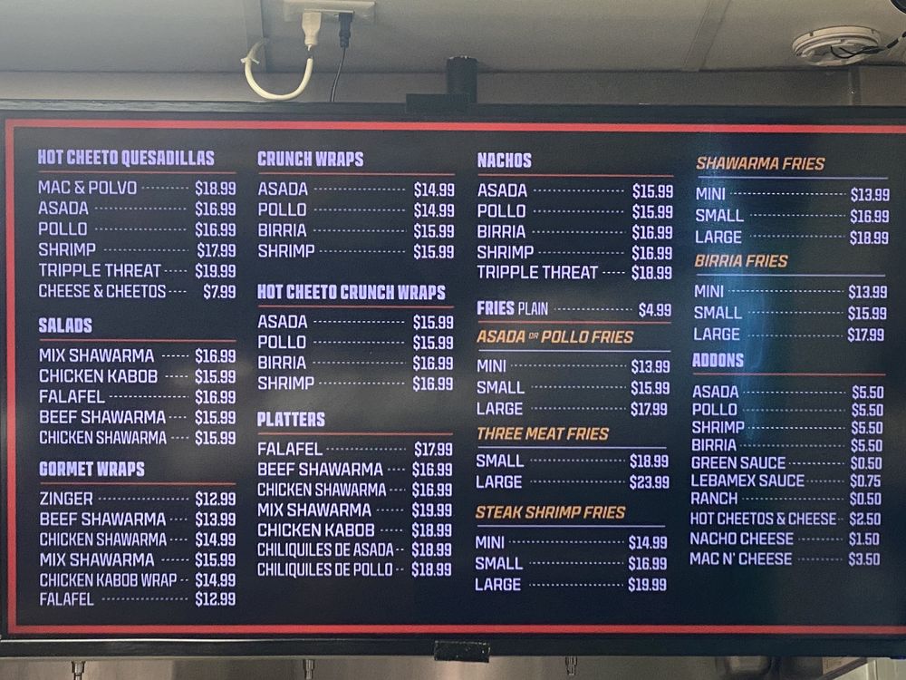 14" tortilla served with fries inside of it, your choice of protein, sour cream, guacamole sauce, and white cheese. mPlease choose your protein