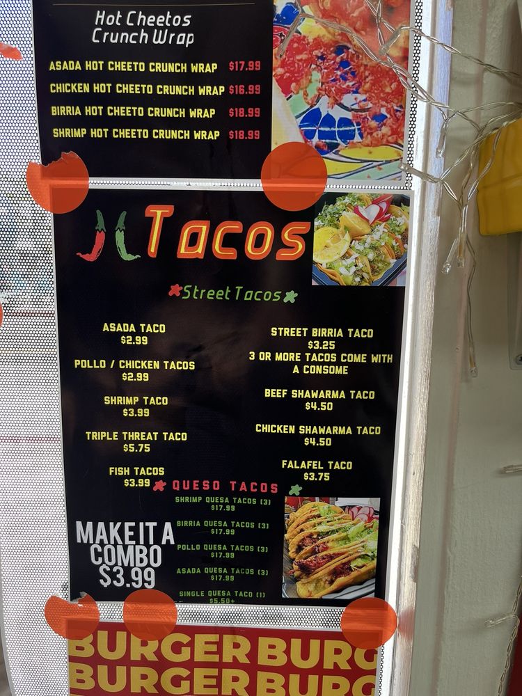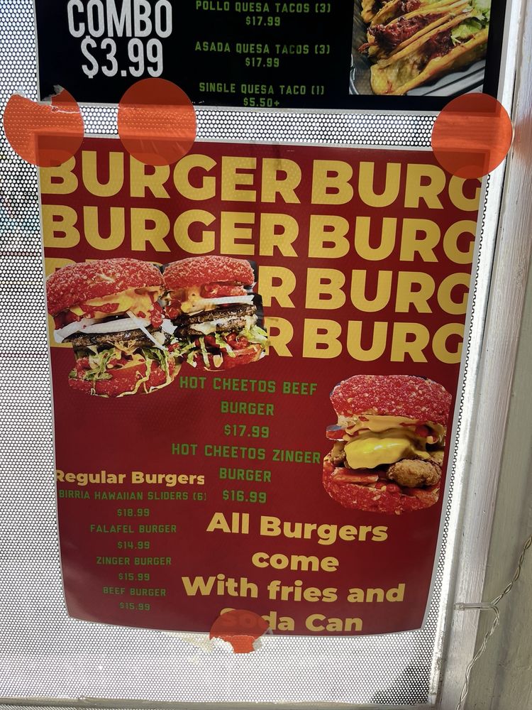 - Hot Cheetos Burger: Two beef patties topped with Hot Cheetos and nacho cheese for a fiery crunch.