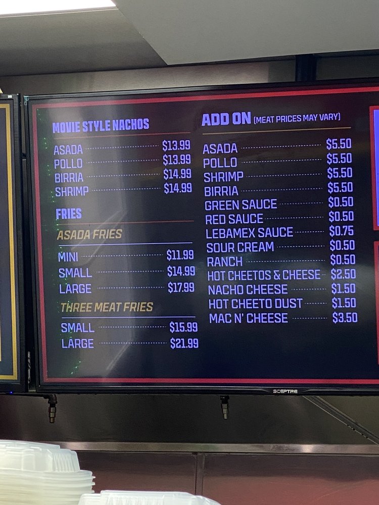Asada served on a bed of Fries topped with Baja sauce, mozzarella cheese, sour cream, guacamole sauce, green sauce, onion, cilantro, jalapeos, and nacho cheese.