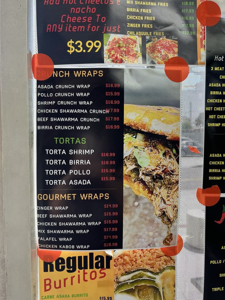 14'' Tortilla, Birria, Beans, Sour Cream, Guacamole sauce, diced Tomato, Lettuce, Hardshell Tostada with Mozzarella Cheese.Comes with a side of Consume.